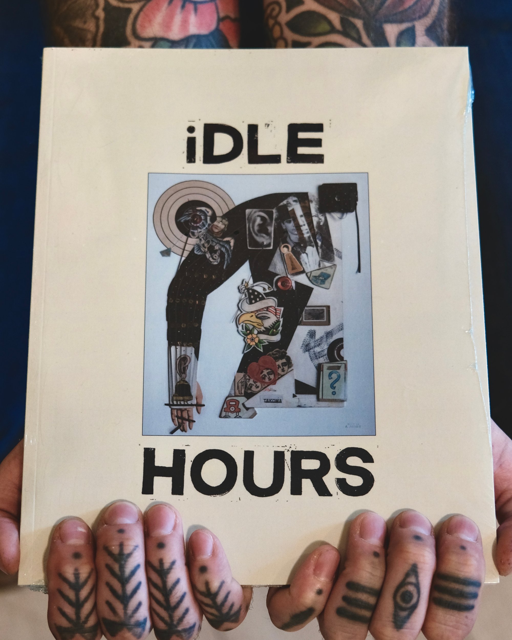 IDLE HOURS show catalog showcasing biographies, tattoos, and work displayed at Idle Hours, a 2024 show hosted by the Wayne County Arts Alliance in Honesdale, PA. Featuring work by Amelia Martin, J. Adams, Jeff Pfeil, Chris Kline, Ryan Mettz, Hillary Fisher White, Erik Von Bartholomaus, Adam Shrewsbury, and Jacob Des. Cover collage by J. Adams. Limited printing.